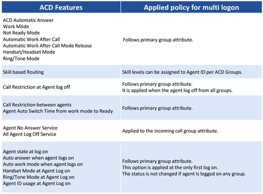 This table shows the features that the agent will follow in primary and secondary groups.