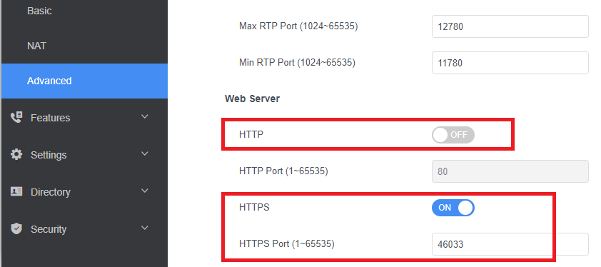 - In Network/Advanced,/Web Server, set HTTP Disabled, check HTTPS Enabled, HTTPS Port, change port to a non-well known one for example 46033.