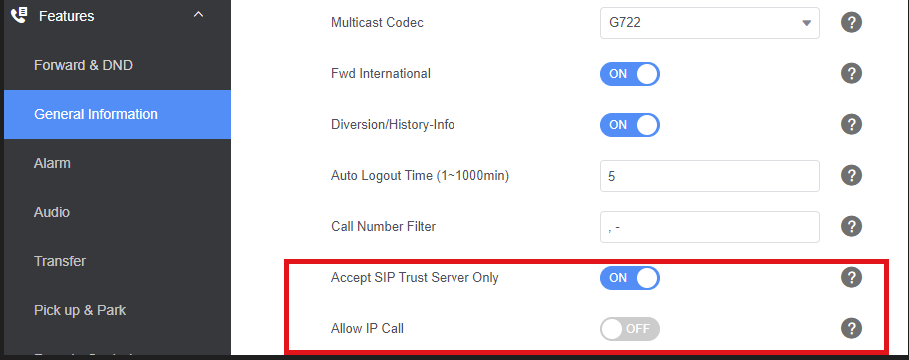 - Features tab under general information change, Accept SIP Trust Server Only to ON.
