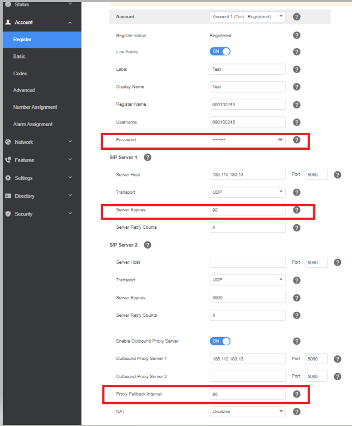 - Account tab left side Register and change Server Expires, change to 90 seconds.