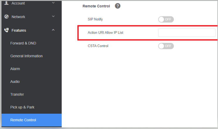 In Features/Remote Control, the Action URI Allow IP List is for the Remote-Control feature. This should be left blank (default) so that no remote IP Address can control the phone.