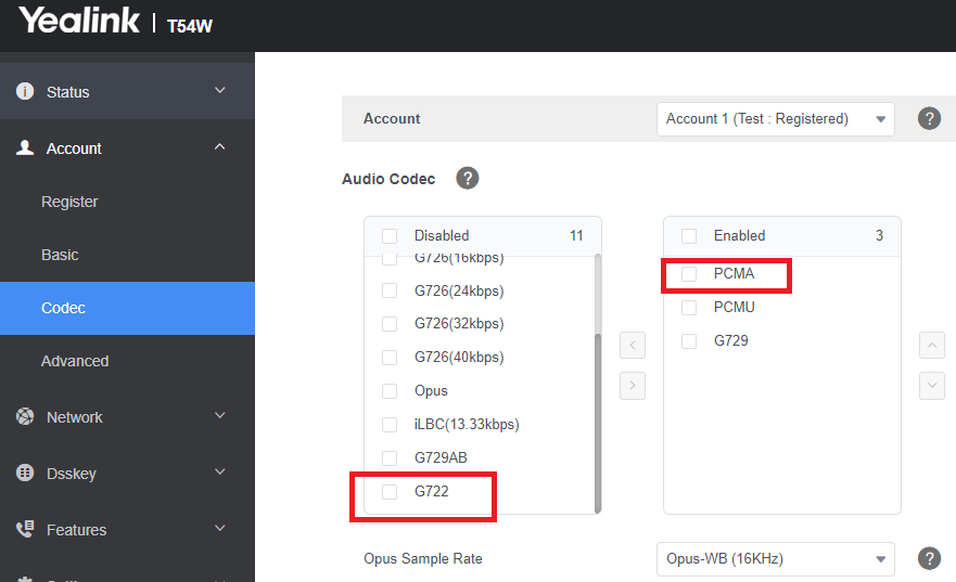 Disable G722 Codec and make PCMA first choice as shown below