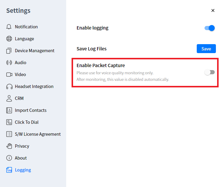 - Within Logging, toggle the radio button next to “Enable Packet Capture”.